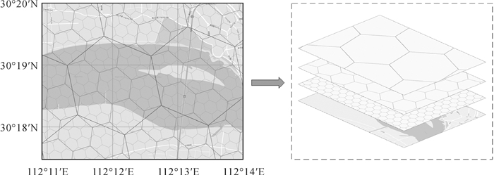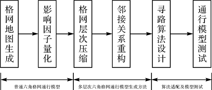 | 图 1 多层次六角格网通行模型生成技术路线 Fig. 1 Multi-hierarchy hexagonal grid traffic model generation technical route |