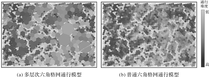 本文使用多层次六角格网通行模型与普通六角格网通行模型进行对比,路径规划算法均为A*算法,启发因素一致,两种通行模型如图 11所示。