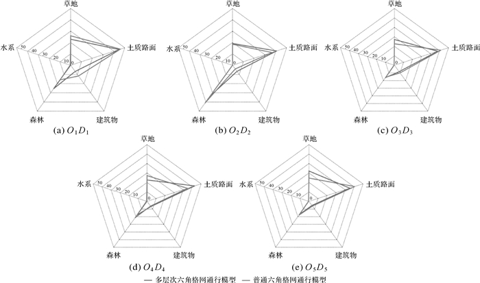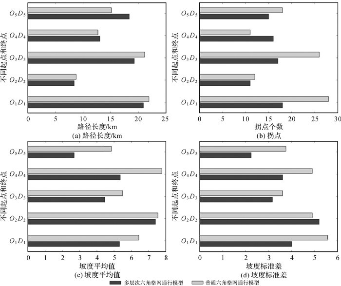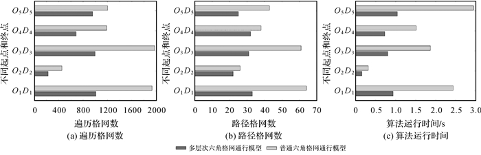 (1) 算法效率对比。本文以遍历格网数、路径格网数、算法执行时间指标对算法效率进行定量分析,其结果如图 13所示。格网层次压缩算法降低了通行模型格网数量的规模,极大地缩小了算法的搜索空间,使得基于多层次六角格网通行模型的路径规划算法相较于普通六角格网通行模型,遍历格网数平均减少了47%。本文提出的路径规划算法在寻找路径的过程中,需要在待遍历格网集合中选择通行能力值最大的格网进行,因此待遍历格网集合越小,路径规划算法的执行效率越高。试验结果表明,基于多层次六角格网通行模型的算法效率较普通通行模型明显提高,其算法执行时间大大降低,平均减少了57%;在路径格网数量上,由于O2D2和O4D4经过的区域格网通行能力的相似度较低,被层次压缩的格网数量较少,所以两种通行模型在路径格网数量上相差不大,但也有16%的数量缩减。