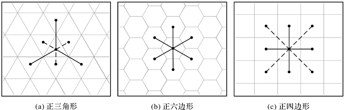 1.1.1 六角格网地图生成格网地图通常由形状为正三角形、正四边形或正六边形的格网组成,适用于不同的应用场景[26-27]。如图 2所示,正六边形与相邻格网只有1种邻接关系且有6个通行方向,正三角形有2种邻接关系和6个通行方向,正四边形有2种邻接关系与8个通行方向。在路径规划中,由于正六边形具有更一致的邻接关系,拥有更多的等距通行方向个数,方便算法处理邻接关系,利于影响因子量化,因此,本文采用正六边形作为格网地图中的格网形状。