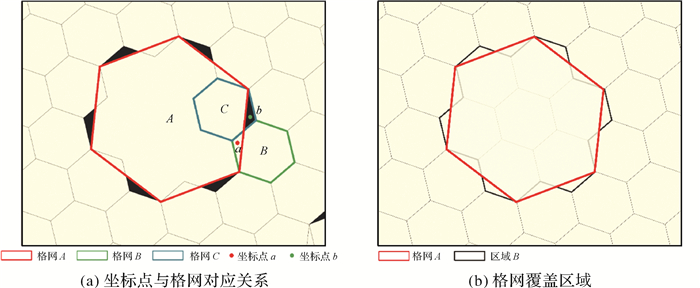 如图 6(a)所示,在获取坐标点a所在格网时,虽然格网A与格网B存在叠加关系,但依照最低层级逐级向上转换策略,坐标点a会被定位到格网B;在获取坐标点b所在格网时,会首先得到格网C,而格网C已被压缩为父格网A,所以坐标点b被定位到格网A。实际上,格网A所覆盖的区域为区域B,如图 6(b)所示。