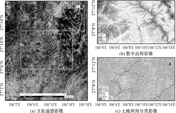 本文选取贵州省毕节市黔西县境内部分区域,如图 8所示,该区域中的地表覆盖类型主要为森林与土质路面,四方山峦绵延,中部地势平坦开阔,较适宜作为试验区。其中遥感影像数据为谷歌卫星影像,空间分辨率为0.6 m;数字高程数据为美国国家航空航天局NASA提供的DEM数据, 空间分辨率为30 m;土地利用分类数据为2020年GlobeLand(http://www.globallandcover.com/)全球土地覆盖,空间分辨率为30 m。