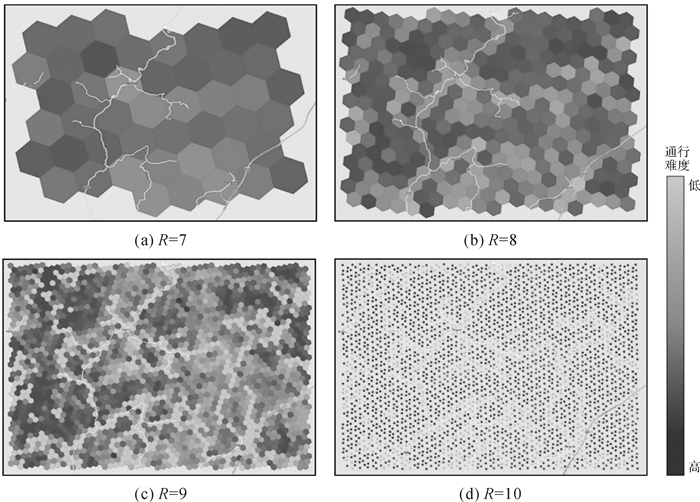 生成多层次通行模型首先需要确定基础格网分辨率,格网分辨率的确定需要综合考虑地图比例尺、研究区域范围大小、应用需求等因素。图 9展示了不同格网分辨率的通行模型,其中线要素为不同等级的公路,在本文中均被表示为硬质路面地表覆盖类型。对比不同格网分辨率的通行模型可以发现,当格网分辨率为R=9时,通行环境可以得到很好的模拟,如图 9(c)所示。以硬质路面为例,在基础格网分辨率采用R=9时,硬质路面经过的格网都表现出了最佳的通行能力。而当基础格网分辨率为R=8、R=7或更低时,格网的表达的通行能力较为粗糙,如图 9(b)右下角所示,格网并没有体现出硬质路面所带来的通行能力提升。在此格网分辨率生成的通行模型中进行路径规划,规划出的路径会出现没有优先经过硬质路面的情况。虽然格网分辨率越大,格网量化精度越高,所表达的通行环境越精细,如图 9(d)所示,硬质路面经过的格网同样表现出了最佳的通行能力;但当格网的分辨率超过地理环境的实际分辨率时,会出现格网量化时没有坐标点相对应的情况。在图 9(d)中,没有坐标点映射的区域存在格网缺失,因此无法进行路径规划研究。综上本文以R=9为基础格网分辨率构建多层次通行模型。