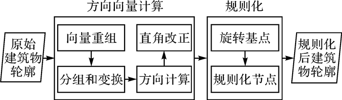 1 基于向量重组的规则化算法 1.1 方法概述基于向量重组的建筑物轮廓规则化算法流程如图 1所示,主要分为2个部分:方向向量计算和规则化。首先输入建筑物原始轮廓,将其转换为一组按照一定顺序组成的向量集合,并计算得到初始向量组。然后,根据向量的方向特征进行分组和变换,将每组向量描述为一个方向特征,进一步通过直角改正加强方向的直角特征,从而得到描述建筑物轮廓方向特征的方向向量。最后,以方向向量为约束条件,计算轮廓边旋转基点,对建筑物轮廓边进行调整,得到建筑物规则化结果。