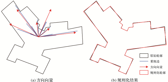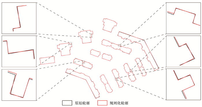 建筑物作为构筑城市的主体,是重要的地理空间要素。利用高分辨率遥感影像[1]、LiDAR点云[2]等各类数据提取建筑物轮廓是摄影测量与遥感领域的研究热点,也是地图制图[3]、智慧城市建设[4]等应用的重要数据源。然而,在原始数据获取和建筑轮廓提取过程中往往存在变形和误差,导致其几何特征无法满足相应的规则和应用要求。因此,在建筑物轮廓提取后,需要进一步对其几何进行规则化处理,构建其规则特征[5-6]。
