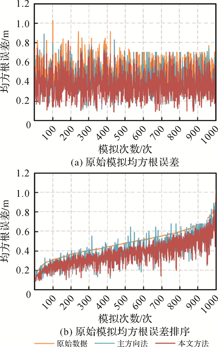 在1000次模拟的直角化结果中,主方向法节点移动最大均方根误差为0.972 3 m, 平均值为0.324 9 m,本文方法最大均方根误差为0.736 8 m,平均值为0.305 1 m。由图 12(b)可知,以主方向法均方根误差从小到大排序,本文方法的误差曲线主要在主方向法误差曲线的下方波动;由图 12(c)可知,以本文方法均方根误差从小到大排序,主方向的误差曲线在本文方法误差曲线的上方波动。