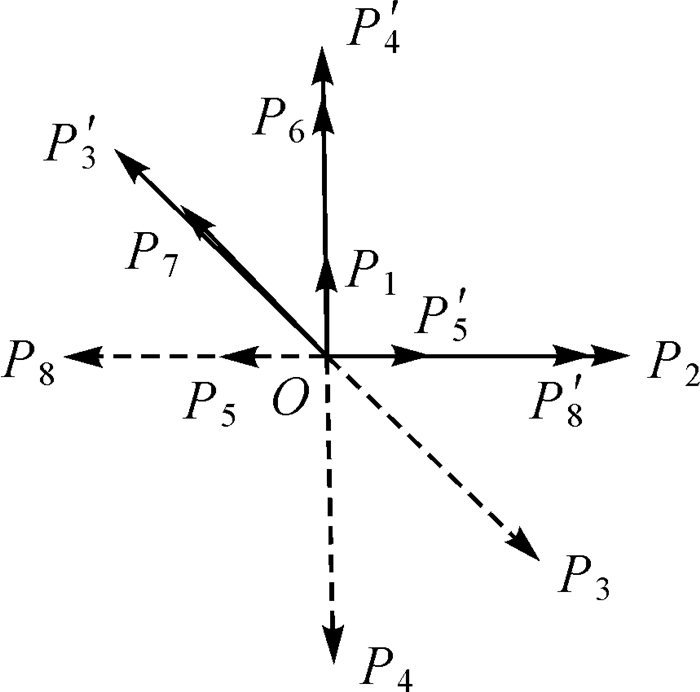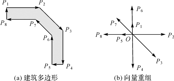 1.2.1 向量重组向量重组是将建筑物的轮廓边转化为向量,则建筑物轮廓可以看作为按照一定顺序组成的向量集合[27],如图 2(a)所示,建筑多边形由P1, P2, …, P8共8个点组成,将多边形的边表示为向量,则多边形由向量P1P2, P2P3, …, P8P1组成的集合。然后,将所有向量的起点平移至同一点,因原始建筑物轮廓的规则特征,重组后的向量具有一定的方向特征。如图 2(b)所示,将向量的起点平移到同一个点O,组成新的向量,如向量P1P2重组为向量OP2,向量P2P3重组为向量OP3。