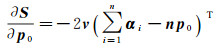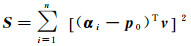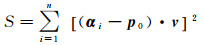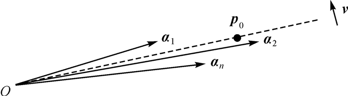 如图 4所示,向量α1, α2, …, αn为一组向量,起点均为点O,假设其分组方向经过点p0,则其向量可表示为p0,向量v为分组方向p0的单位法向量。当分组方向满足总体最小二乘时,向量α1-p0, α2-p0, …, αn-p0在向量v投影长度的平方最小,即向量α1-p0, α2-p0, …, αn-p0和向量v点乘的平方和最小,可得目标函数