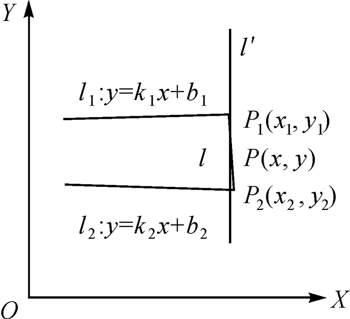 为简化推导过程,以l′的方向为纵坐标轴方向,垂直方向为横坐标轴方向,取一点O为原点建立坐标系,设l1和l2在建立坐标系的直线方程分别为y=k1x+b1和y=k2x+b2。点P1为l和l1的交点,坐标为(x1, y1),点P2为l和l2的交点,坐标为(x2, y2),点P坐标为(x, y),则l′和l1交点P′1的坐标为(x, k1x+b1),l′和l2交点P′2的坐标为(x, k2x+b2)。