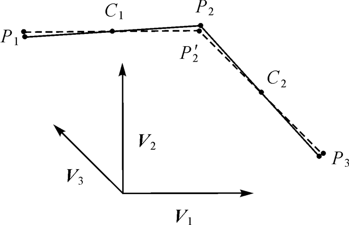 使用上述方法实现建筑物轮廓规则化时,待调整边只和节点坐标及相邻边的夹角有关。为防止调整时的迭代,夹角通过各边向量重组后的方向计算,逐点计算规则化后的节点。获取节点所在两个边的方向,判断边对应的方向向量,计算相邻边方向向量的夹角,根据夹角和节点坐标,按式(9)和式(10)计算每条边的旋转基点,并绕旋转基点对边进行旋转,使其和对应的方向向量一致。然后,计算相邻旋转边的交点,即为规则化以后的节点坐标。如图 8所示,对节点P2处理,其所在的边P1P2对应的方向向量为V1,边P2P3对应的方向向量为V3,P1P2绕点C1旋转至和向量V1的方向一致,P2P3绕点C2旋转至和方向V3一致,求旋转后两条线的交点,得到点P′2,点P′2即为P2规则化后的节点。对多边形所有节点进行同样的处理,用规则化后的节点替换原来的节点,最终得到规则化后的多边形。