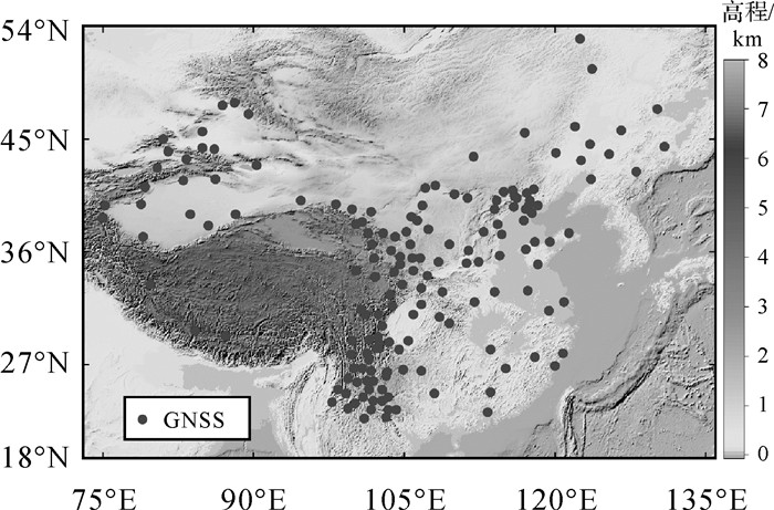 | 图 1 试验选取的中国区域GNSS站点分布 Fig. 1 Geographical distribution of GNSS stations selected in China |