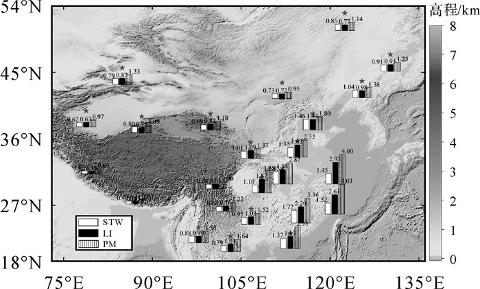 | 图 4 3种填补方法在中国不同区域的RMS对比分布 Fig. 4 RMS distributions of the STW, LI and PM methods in different regions of China |
