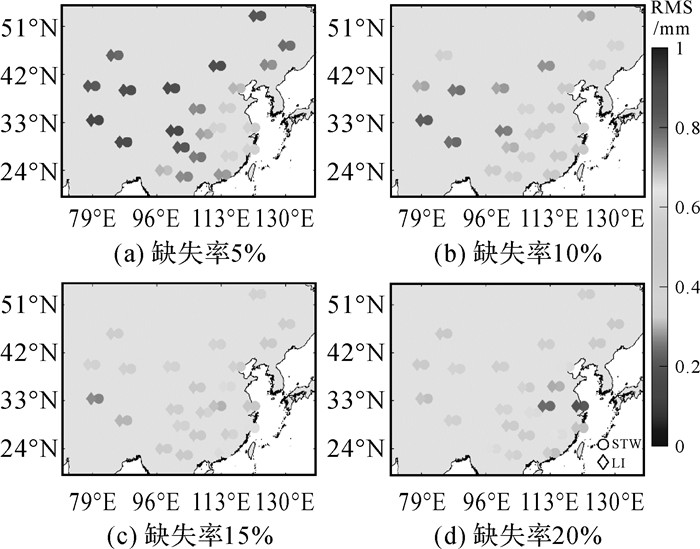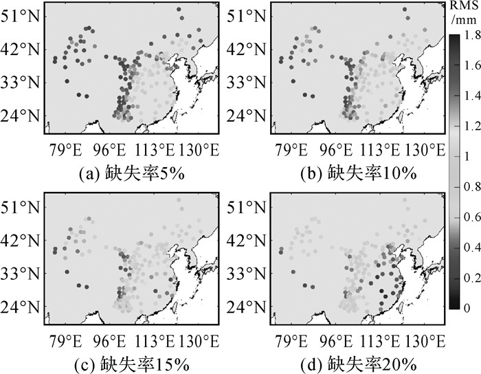 | 图 5 缺失率在5%、10%、15%和20%情况下STW方法在中国区域的RMS站点分布 Fig. 5 RMS distribution of the STW method at GNSS stations for missing rates of 5%, 10%, 15% and 20% |