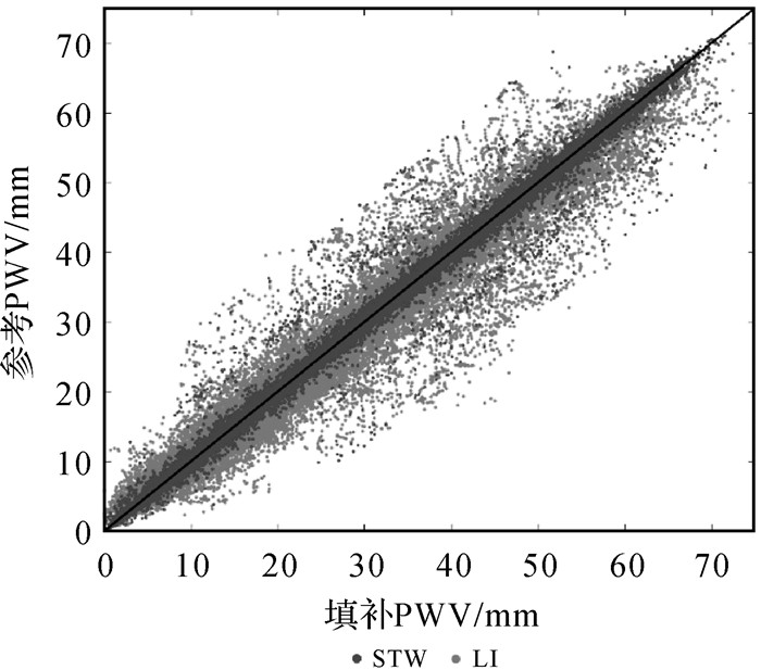 多种技术的相互补充可以使获取的PWV时间序列比单一技术获取的结果更加稳健和可靠,而再分析数据集提供的PWV具有时间跨度较长和空间覆盖完整的优点[18]。针对上述现状,本文充分考虑现有GNSS PWV时序缺失数据的分布和间隔随机性,借助ERA5能够提供长时序和稳定PWV的特性,同时顾及PWV的时间和空间变化特征,对GNSS技术获取的PWV长时序中的缺失值进行填补。试验表明,在各种PWV缺失的应用场景中,本文提出的STW方法对PWV长时序进行填补较传统线性插值和模型替换方法均具有较好的效果,可用于PWV长时序的缺失填补和分辨率提升。