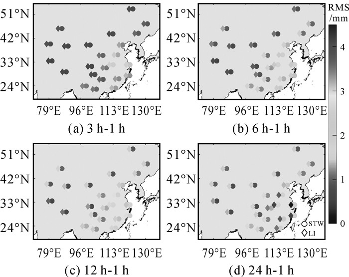 以最高数据缺失率20%的试验环境为例,利用3种方法(LI方法、PM方法和STW方法)对缺失数据进行填补。为具体展示不同方法在PWV长序列中的填充结果,图 3给出了3种方法在HBXF站点在随机缺失20%情况下GNSS PWV长时序的填补对比。可以看出,模型填补方法只能保留PWV序列的长期趋势,时空填补方法计算的PWV值较线性插值方法更接近实际PWV值。通过计算,模型替换、线性插值和时空填补方法计算缺失PWV的RMS分别是2.87、1.98和1.68 mm。图 4给出了中国区域均匀分布的24个GNSS站点上利用3种方法对缺失GNSS PWV序列进行填补的RMS分布。图中定性给出了不同方法填补缺失PWV值的数据精度与站点高程有很强的关联,高程越高,其RMS值越小。模型替换方法在所有GNSS站点上精度最差,不适合日分辨率的水汽缺失填补。而除高纬度的个别站点外,本文提出的顾及时空加权的填补方法在任意位置上均优于线性插值方法,尤其是在PWV较大的中国东南地区。