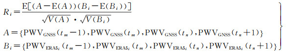 式中,(φGNSS, lGNSS)和(φERA5i, lERA5i)分别表示GNSS站点与ERA5 4个格点的经度和纬度;r表示地球半径(单位为km)。而时间相关系数Ri由包括公共历元tm和tn在内的4个连续共有历元数据计算得到,计算公式如下