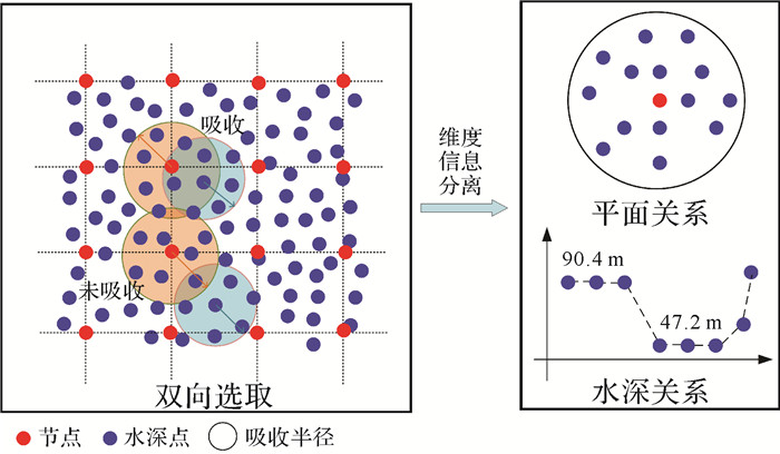 只有水深点位于节点吸收域内同时节点也位于水深点的影响范围内,该水深点才可以被节点吸收,如图 2所示。这是CUBE滤波算法极具特色的“双向选取”机制,形成推估曲面完成了水深点三维信息(X, Y, Z)中平面信息(X, Y)与深度信息(Z)的分离,因此DBSCAN算法对一维水深信息进行聚类即可。