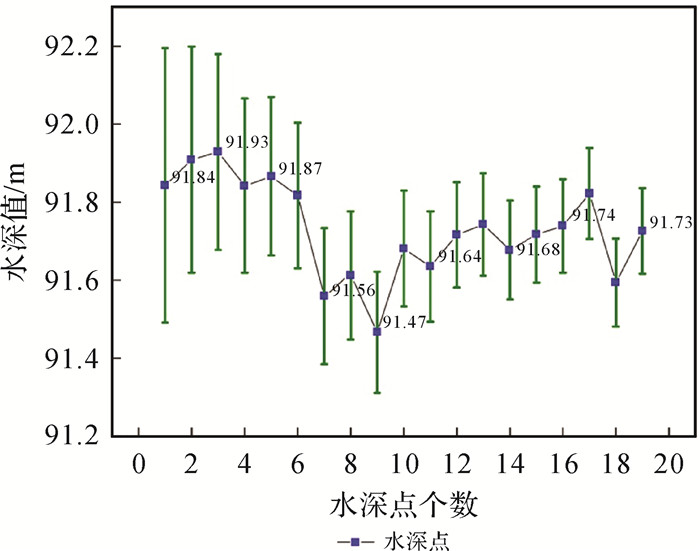 启用卡尔曼滤波器进行水深点和不确定度的推估,推估形成的可能代表该节点水深值,称为水深假设。推估流程及卡尔曼滤波使用公式见文献[13, 16—18]。卡尔曼滤波器随着吸收水深点数量的增加,水深假设的不确定度逐渐减小。这一过程是在先验观测值(类质心的近似值)的基础上,多个后验观测值不断对先验观测值进行修正。图 4显示了某节点水深值和不确定随着水深点个数增加推估得到的水深值和不确定度,其中不确定度以误差棒表现,误差棒缩短代表的水深值不确定度越来越小,水深值的可信度越来越高,这一规律成为最优估值选取的基础。