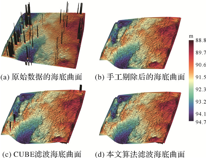 由实测数据试验结果对比分析可知:①手工剔除法、CUBE滤波算法和本文算法的结果水深值范围均小于原始实测数据,说明了3种方法均可以滤掉原始实测数据中的异常值点;由图 6可知,经过处理后测深数据的异常值均减少(或完全剔除); ②手工剔除法和本文算法结果水深极小值均为88.62 m,极大值均在94~95 m,见图 6(b)、(d),比较真实地还原了连续的自然海底变化,而CUBE滤波算法结果极小值为47.88 m,极大值为110.64 m,说明存在一些异常值未能剔除,见图 6(c);③手工剔除法和本文算法滤波效果较为理想,CUBE滤波算法滤波处理后的测深数据仍存在着个别异常值点,经与原始实测数据对比分析,发现CUBE滤波算法处理结果残留的异常值点主要出现在原始测深数据中连续异常值出现的区域。