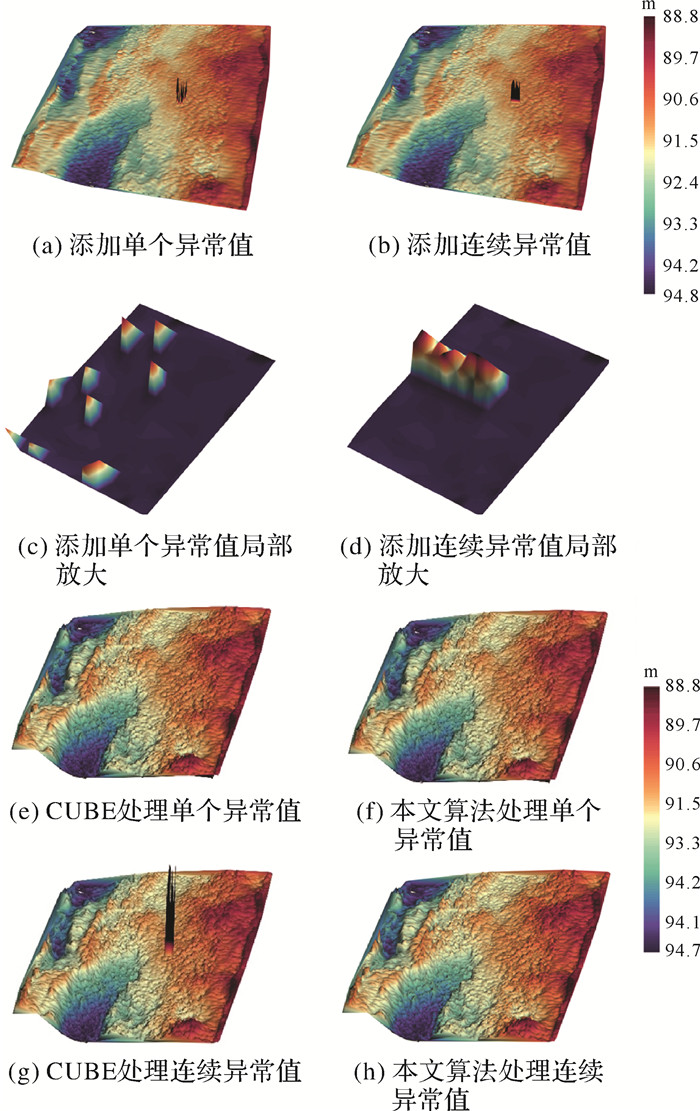 由仿真试验结果分析可知:①方案一中,CUBE滤波算法和本文算法与添加单个噪声的数据对比,极小值均为88.62 m,与表 2手工剔除法的极小值数据一致,说明处理单个异常值时,CUBE滤波算法和本文算法据能够识别并加以剔除;图 7(e)、(f)与图 7(a)相比,凸出周围地形趋势的异常值被剔除,得到了连续变化的真实自然海底,与图 6(b)手工剔除法一致。②方案二中,表 3中CUBE滤波算法处理连续噪声点结果极小值为76.14 m,而本文算法处理结果极小值为88.62 m,与表 2手工剔除法的极小值数据一致,证明CUBE滤波算法未能将添加的连续异常值剔除完全,本文算法可以较好地剔除连续异常值;图 7(g)显示了CUBE滤波算法无法完全剔除异常值,推估曲面构建受到异常值的影响,从而影响对测深数据异常值的剔除,导致海底地形不真实;图 7(h)显示本文算法剔除了连续异常值,得到了同图 6(b)相近的连续变化的真实自然海底。