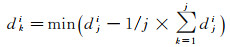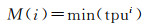设某一节点可吸收水深值聚类结果为M(i),M(i)={d1i, d2i, …, dji; tpu1i, tpu2i, …, tpuji},dji表示第i个类中第j个水深值,tpuji第i个类中第j个水深点的不确定度,则通过式(3)确定第i个类中第k个水深点为类质心近似值