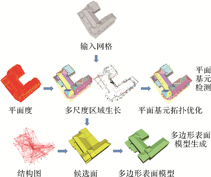 1 单体结构化重建算法本文基于文献[21]提出的Polygonization方法,进行了多尺度区域生长提取网格平面基元、平面基元拓扑优化两个方面的改进,提出了一种有效且稳定的建筑物单体结构化重建的变尺度网格基元提取方法,重建出了更简洁紧凑的、结构化的多边形表面模型。本文的算法包括平面基元检测和多边形表面模型生成两个步骤,如图 1所示。Polygonization方法[21]采用单一尺度的平面基元提取方法,提取的平面基元不够完整和准确。为解决这一问题,本文提出多尺度区域生长算法和平面基元拓扑优化方法来提升平面基元提取的完整性和准确性。