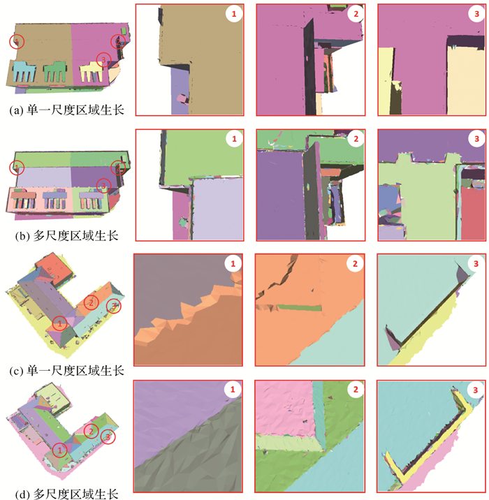 为了突出体现多尺度区域生长算法的有效性,本文进行了多尺度与单一尺度区域生长算法的对比试验(图 10)。通过图 10可以发现单一尺度区域生长算法由于将噪声和几何缺陷也提取到平面基元中,导致提取的平面基元并不准确规则,建筑物尺度较小的几何结构损失严重,直接降低了多边形表面模型的重建精度,甚至会导致重建失败。相比之下,多尺度区域生长算法降低了噪声和几何缺陷的影响,能够准确完整地提取出女儿墙、烟囱、多层屋顶、配电箱等尺度较小的几何结构所对应的平面基元,平面基元的边界处也更加准确规则,损失了较少的几何结构特征,能够更稳健地对建筑物网格模型进行平面基元的提取。
