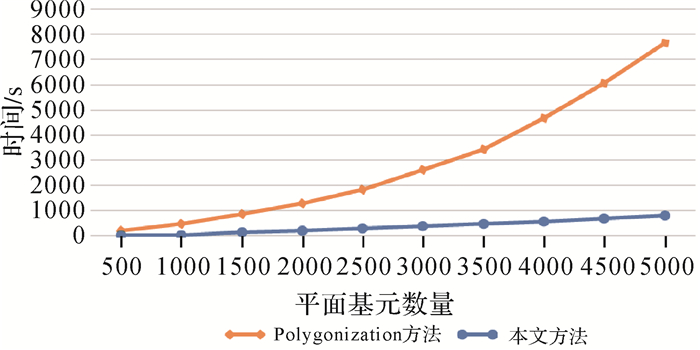 平面基元拓扑优化过程中,本文通过面积优先级策略合并共面的平面基元,减少平面基元的遍历次数,有效提高了合并效率。为了更直观地突出面积优先级策略的效率提升,本文进行了的对比试验。由于合并效率和平面基元的数量有关,因此试验采用的网格具备不同数量的平面基元,试验结果如图 11所示。通过图 11可以发现,面积优先级策略相比穷举方法,计算复杂度低,合并效率明显提升,在本文试验所用的网格上提高了5~10倍。