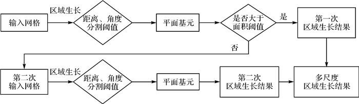 多尺度区域生长算法流程如图 3所示,首先通过检索初始种子面k-ring邻域三角面包含的网格顶点,拟合出初始参考平面,通过添加满足距离分割阈值和角度分割阈值的k-ring邻域三角面形成新的种子面,逐步向外扩张,重复整个过程直到将整个网格提取为若干平面基元,并标识不同的颜色进行可视化表示。