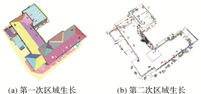第一次区域生长采用的距离分割阈值难以提取尺度较小的平面基元。为此,本文首先设定适宜的面积阈值将尺度较大的平面基元筛选出来,对尺度较小的几何结构所对应的平面基元进行第二次区域生长。第二次区域生长的距离分割阈值由剩余的三角面边长重新计算,而角度分割阈值不变。