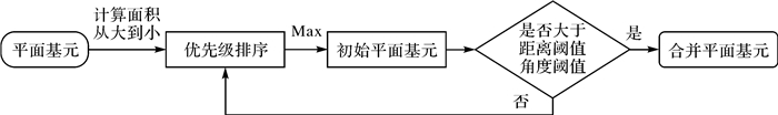 平面基元拓扑优化包括两个内容:合并共面的平面基元及恢复平面基元的邻接关系。Polygonization方法[21]穷举所有的平面进行合并,计算复杂度高。而本文采用面积优先级策略(图 5),减少平面基元的遍历次数,提高合并的效率。具体如下:①首先计算平面基元的面积,按照面积从大到小进行优先级排序;②选择面积最大的平面基元作为初始平面基元,按照优先级逐一去遍历其他平面基元,计算两个平面基元之间的投影距离和法向夹角,将满足距离阈值(参照式(1))和角度阈值(设为10°)的平面基元与初始平面基元进行合并;③未满足合并条件的平面基元重新筛选出优先级最高的作为初始平面基元,继续按照优先级执行合并;直到完成所有共面平面基元的合并。