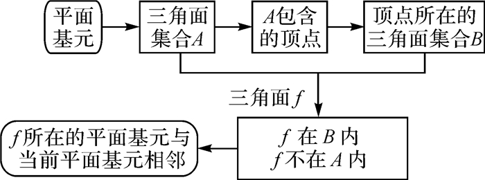平面基元之间的邻接关系需要依靠三角面来确定,具体过程如图 6所示。只要两个平面基元之间存在至少一个公共的网格顶点,就认为它们是相邻的。恢复平面基元之间的邻接关系,保证拓扑完整准确,这对后续确定建筑物的轮廓至关重要。