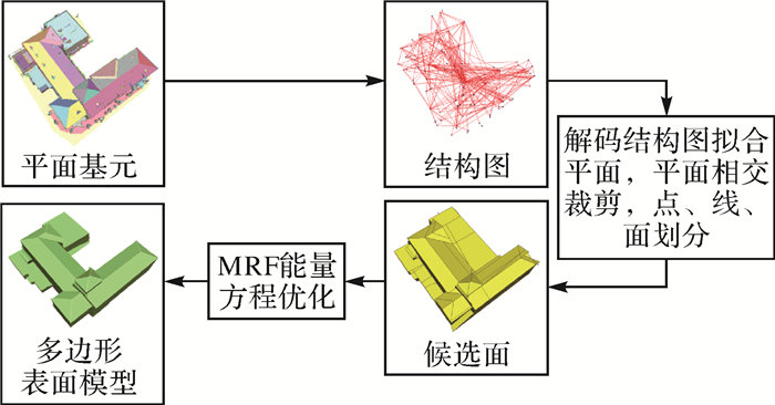 如图 7所示,根据平面基元之间的邻接关系,本文构建一个结构图来存储平面基元。结构图中的每一个顶点对应于一个平面基元,而如果两个顶点对应的平面基元相邻,则用一条边进行相连。为了更加准确有效地生成候选面,将结构图中的平面基元拟合成平面,通过平面的相交裁剪确定建筑物的轮廓,进而生成候选面。最终通过MRF的能量方程优化从候选面中筛选出一组最优的平面生成水密流形的多边形表面模型。