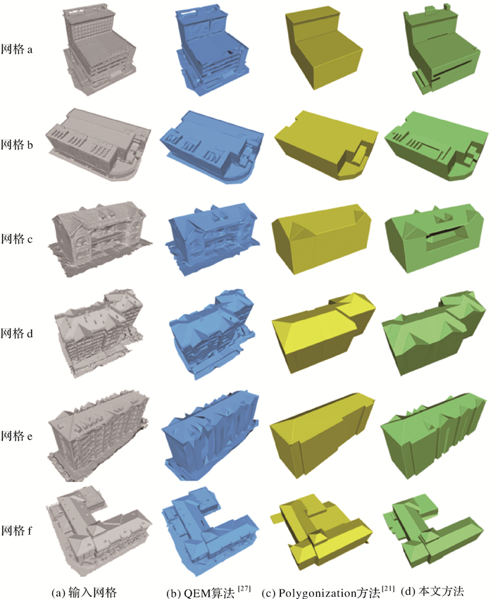 2.1 试验结果试验结果如图 8所示,第一列输入的原始网格是通过文献[26]的方法创建的单个非封闭建筑物网格,网格的复杂程度从网格a—网格f逐渐递增,噪声也随之递增。第二列是采用二次度量误差(quadic error metrics, QEM)[27]网格简化算法进行简化的效果,第三列是采用Polygonization方法[21]生成的多边形表面模型,第四列是本文方法生成的多边形表面模型。