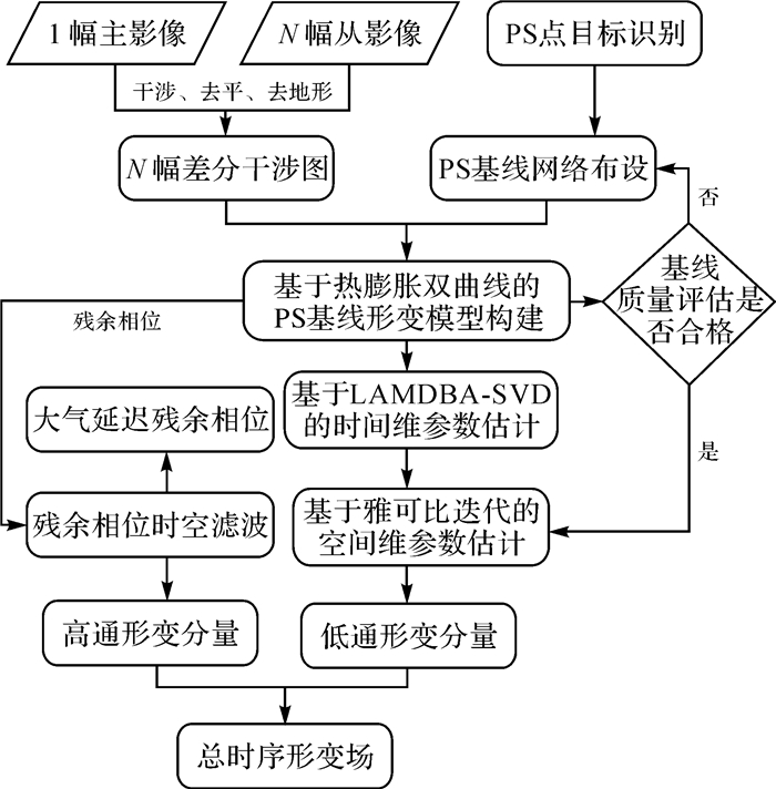 在时间维和空间维参数估计完成之后,即获取了研究区所有PS点的形变参数值,对这些形变参数在时间域上积分,即得到PS点上的低通形变分量。在PS基线网络布设时,设置基线边距离均不超过800 m,以尽最大可能减弱大气延迟相位的影响。通过对残余相位进行时空滤波以分离出残余相位中残留的高通形变分量部分,再与低通形变叠加,得到整个研究区域的时序形变场。算法流程如图 1所示。