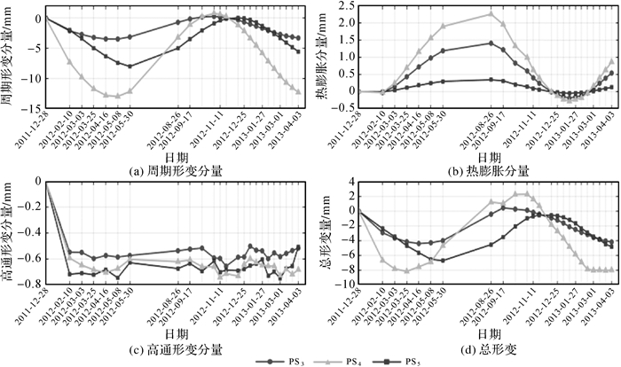 分别提取了洞庭湖大桥的3个特征点(见图 8中PS3、PS4和PS5),其时间序列形变如图 10所示。由于PS3与PS5位于河两岸的桥墩附近,形变结果接近,相比于位于桥梁中间的PS4形变整体浮动偏大。由图 10中可以看出,在3个特征点上的总时序形变都呈现出明显的周期性变化,其中周期形变分量都达到了80%以上,最大可达-13 mm,而热膨胀分量形变都在±2.5 mm之内。