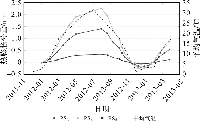 | 图 11 热膨胀分量与环境气温 Fig. 11 The thermal expansion-related deformation component and the air temperature |
