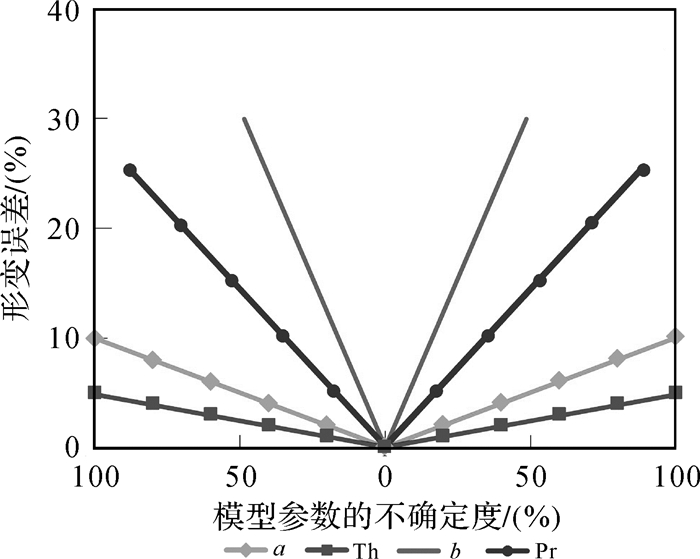 根据文献[32]所述,InSAR形变模型获得的形变精度主要取决于模型参数估计的精度。如果估计形变对某个参数高度敏感,说明这一参数的微小误差则会导致最终估计形变的较大变化。而对于那些不敏感的参数,即使引入了一定的误差,对最终估计的时序变形结果也不会造成较大影响。因此,对模型开展参数敏感性分析,不但可以揭示模型参数对形变的影响规律,还可以有效地指导InSAR数据处理,具有一定的理论和实践意义。在此,利用模拟数据对热膨胀双曲模型的参数和估计形变开展敏感性分析试验。利用8组不同的模型参数来生成最终的形变,表 3显示了4个参数的模拟值Ms和每个模型参数的误差Mr范围。模型的不确定度是根据函数