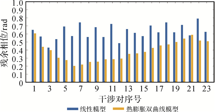 (1) 本文提出将双曲线模型作为PSInSAR处理基础模型,并融入热膨胀和降水参数分量,取代原线性速率模型,在理论上顾及了软土形变随时间呈非线性变化的物理特征、湖区基础设施的热膨胀效应和外界环境降水的影响因素。相比于传统线性速率模型,本文方法残余相位的显著提升也证实了方法的可靠性。本文方法可利用InSAR相位方程组估计出各PS点的热膨胀系数值,由此可以计算出基础设施的热膨胀特性参数,提供了一种利用InSAR相位观测值获取材料热膨胀参数的手段。