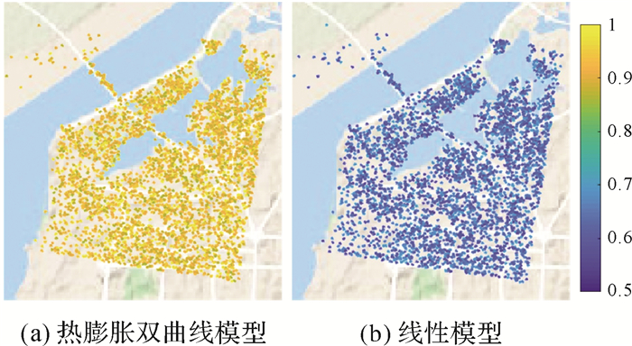由文献[34—35]可知,时间相关系数也可以作为模型建模精度的又一指标。对应PS点上的时间相关系数越高,则表明其建模精度越高。因此,本文计算了所有PS点在不同模型下的平均时间相关系数,结果如图 14所示,可以明显看出热膨胀双曲线模型的平均时间相关系数(整个图都是深黄色)整体显著高于线性模型结果。热膨胀双曲线模型在所有PS点上的平均时间相干系数STD为0.92,而线性模型为0.63。
