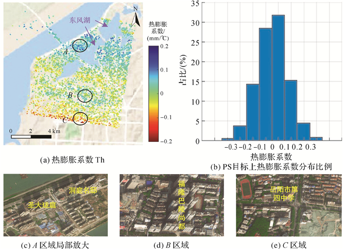 图 4(a)显示了测区内热膨胀系数Th的分布结果,图 4(b)为PS点上热膨胀系数的定量分布统计结果。可以发现热膨胀效应对于此测区地表形变的影响非常明显。通过统计分析,58%的PS点其热膨胀系数值分布在[-0.1, 0.1] mm/℃内,86%的PS点在[-0.2, 0.2] mm/℃内,95%的PS点在[-0.3, 0.3] mm/℃内。从颜色空间分布可以看出,热膨胀系数值在不同区域存在显著差异,从北至南呈现数值降低的趋势,且数值有正有负。这一现象的原因是在热膨胀特性参数恒定的情况下(当不同的基础设施由类似的材料制成时,其热膨胀特性参数视为恒定),热膨胀系数值与建筑物的高度成正比[28-29]。通过研究区域历史谷歌影像可知,在2012—2013年期间,研究区域由北向南建筑物高度整体呈由高向低的趋势,与本文获取的热膨胀系数分布整体保持一致。数值有正有负的原因如图 5所示,热膨胀导致的监测对象上某个点的总形变是水平形变和垂直形变的矢量之和,当这个点沿视线向远离SAR传感器时,该点的水平形变表现为负值。因此当建筑比较高时,其水平方向膨胀在雷达视线向分量较小,而竖向的分量则较大,使得热膨胀引起的总形变为正[28-29]。为详细分析热膨胀系数分布的特征,本文分别在研究区域内的北部、中部和南部3个典型区域开展局部分析。以图 4中A、B、C几个典型区域为例,由局部放大图(图 4(c)、(d))可以看出,A、B区域都以高楼为主,因此其热膨胀系数值均表现为正。其中A区内最大热膨胀系数达0.31 mm/℃,B区的热膨胀系数为0.1 mm/℃。而C区的情况则相反(4(e))。C区主要以学校、老住宅区、长条型道路为主,建筑物高度相对较低,水平方向膨胀在雷达视线向负向的分量,远远大于其竖直向的热膨胀抬升,使得到的热膨胀参值以负值为主,热膨胀系数最小为-0.23 mm/℃。