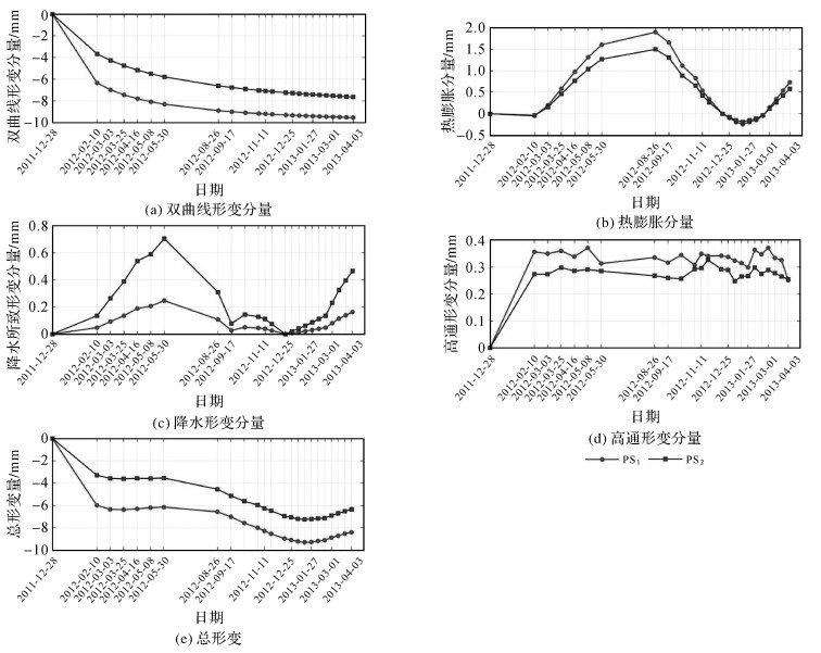 为了更清晰地显示变形的时序演化过程,分别提取了两个特征点开展时序形变分析。如图 8所示,PS1位于岳阳市巴陵广场瞻岳门城楼楼顶东南角处,PS2位于岳阳市岳阳楼区建设北路与外滩一路交叉口以南50 m处。图 9为两个特征点上各形变分量的时间序列演化情况。PS点上各形变分量的占比如表 2所示。可以看出,无论是PS1还是PS2,总形变均以双曲线分量为主,占比分别为81.5%和78.6%;热膨胀及降水相关形变分量均小于2 mm。PS1的累积沉降量达9.5 mm,发生在2013年1月16日,而PS2累积沉降达7.4 mm。