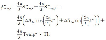 式中,Sdefo_im为周期模型形变分量;T1为周期性形变的周期(取为一年);ΔAi, j和ΔBi, j为待求的周期形变速率参数。
