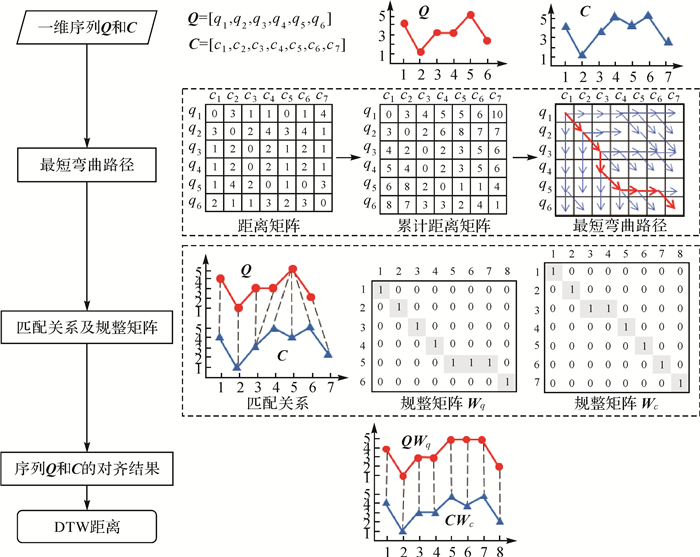 图 1展示了通过DTW算法进行序列对齐的基本流程。以一维时间序列Q=[4, 1, 3, 3, 5, 2]和C=[4, 1, 3, 5, 4, 5, 2]为例,序列Q的长度为6,序列C的长度为7。首先,构建两个序列之间的距离矩阵,由不同的弯曲路径得到累计距离矩阵,通过路径回溯得到最短弯曲路径(红色路径)。其次,根据路径长度,可知对齐两个序列所需的索引数K为8;根据路径走向(c3对应于q3和q4;q5对应于c4、c5和c6),可知序列的匹配关系及对齐序列Q和序列C的规整矩阵Wq和Wc,其中Wq为6×8的矩阵,Wc为7×8的矩阵。最后,将序列Q和C分别与两个规整矩阵相乘,得QWqT=[4, 1, 3, 3, 5, 5, 5, 2],CWcT=[4, 1, 3, 3, 5, 4, 5, 2],二者之间的欧氏距离即为原序列Q和C之间的DTW距离,经计算该距离为1。