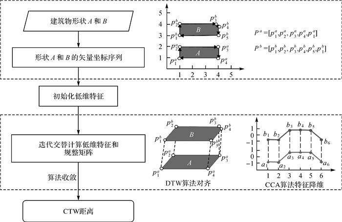 图 2展示了基于CTW算法进行建筑物形状相似性度量的流程,图中以建筑物形状A和形状B作为具体示例。首先,根据建筑物形状可得相应的矢量坐标序列,其中形状A具有4个节点,形状B具有5个节点,形状A和B的矢量坐标序列分别为:Pa=[p1a, p2a, p3a, p4a, p1a],Pb=[p1b, p2b, p3b, p4b, p5b, p1b]。然后,初始化低维特征VaT=I,VbT=I,根据算法调整低维特征和规整矩阵,形状A和形状B经过DTW算法匹配可得到的各个节点之间的对应关系。其中,形状A的节点p3a对应于形状B的节点p3b和p4b,需在p3a处插入一个相同点使得序列Pa和Pb之间的长度一致。序列对齐后CCA算法降维结果表现为一一对应关系,即序列a=[a1, a2, a3, a4, a5, a6],b=[b1, b2, b3, b4, b5, b6]。最后,通过迭代交替计算低维特征和规整矩阵直至算法收敛,可得建筑物形状A和B之间的CTW距离为0.001。这两个形状之间的DTW距离为11.95,远大于CTW距离,说明CTW算法更适合度量建筑物形状之间的相似性。