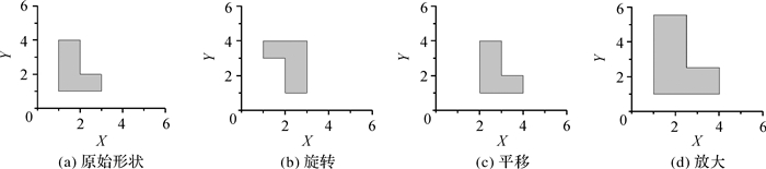 图 3是L型建筑物(图 3(a))和经过旋转(图 3(b))、平移(图 3(c))和放大(图 3(d))后的形状示例图。为了证实CTW算法的平移、旋转和缩放不变性,本文对比了形状a与形状b、c、d之间的CTW距离与DTW距离。由表 1可以看出,形状a与形状b、c、d之间DTW距离远大于CTW距离,且CTW距离几乎为0,说明平移、旋转和放大后的形状与原始形状非常接近。这一结果符合人类的视觉空间认知,证实了使用CTW算法计算形状相似性的可行性。