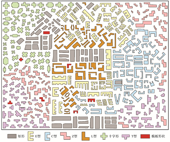 本文选出了7种典型的形状:矩形、L形、E形、十字形、C形、T形和Z形,并选取了420个类似的形状作为试验数据,其中每种类型分别包含60个建筑形状。在数据采集和存储的过程中,参考数据中可能会有一些异常节点,如冗余点和共线点[34],这些点需要在试验前删除。之后将这些建筑物图形缩放、平移至同一图幅,如图 4所示。另外,本文构建了7个基本形状模板来方便比较形状相似性(图 4中的红色形状)。