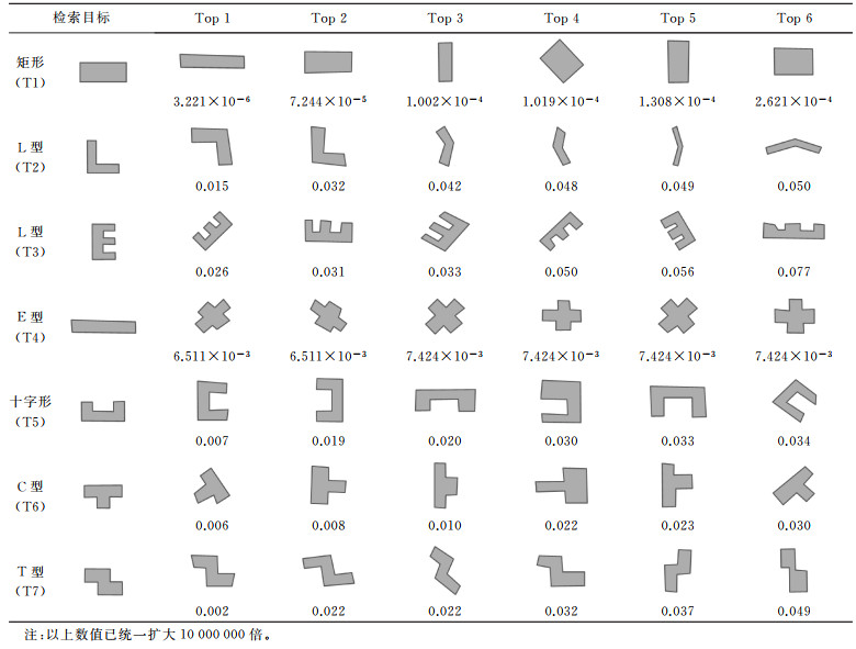形状检索是以人类认知的角度从GIS数据库中找到与模板形状匹配的目标图形,建筑物形状检索的关键问题在于形状相似性的度量。本文方法可有效应用建筑物形状检索。表 5记录了与每个模板形状最相似的前6个建筑物以及它们之间的CTW距离,可以看出,这些形状与模板形状在视觉上都较为相似,表明CTW算法可以有效地应用于形状检索场景。其中,对于矩形和十字型建筑物而言,模板形状与前6个形状在视觉上非常相似,其形状之间的CTW距离最小,且矩形形状的长宽比对形状相似性度量结果没有太大影响;对于C型和T型建筑物而言,其模板形状具有对称性,而第4个C型建筑物和第5个T型建筑物并不具备,表明多边形的矢量坐标序列对形状的整体特征具有较好的表示能力。此外,在Z型建筑物的检索结果中,前5个建筑物形状均为Z型模板形状旋转、缩放或平移后的图形,而第6个形状为Z型模板的镜像图形,说明CTW算法不仅具有旋转、缩放、平移不变性,还具有镜像不变性。