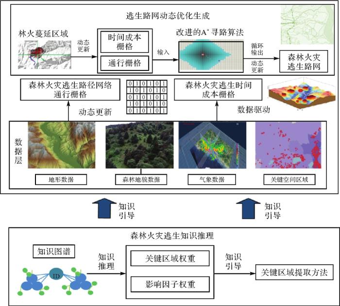 知识引导的森林火灾逃生路网动态生成方法总体研究思路如图1所示。首先,系统梳理森林火灾领域知识概念,建立相关知识图谱,并在其引导下设计规则库,进而实现森林火灾逃生关键空间信息的高效精准提取;然后,针对林火场景复杂多变导致逃生路径规划准确性与安全性差的问题,在关键空间信息约束下,创建森林火灾逃生通行栅格网络模型与逃生时间成本栅格网络模型;最后,通过动态更新林火蔓延区域,设计改进A*算法的逃生路网动态优化生成算法,最终实现逃生路网的动态优化构建。