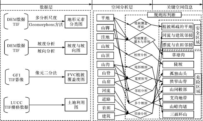 本文首先依据森林火灾关键空间区域的地形、地貌等特征,选择相关的数据集并确定坡度坡向、FVC像元二分法、综合多分析尺度下的Geomorphons法[34]等提取方法与数据集。然后根据规则库中的空间关系约束、属性约束等规则进行空间分析。最后,提取出森林火灾逃生关键区域中的危险区和安全区。知识图谱阐明,河流和道路为安全性最高的区域,能够作为逃生路网的安全目的地。